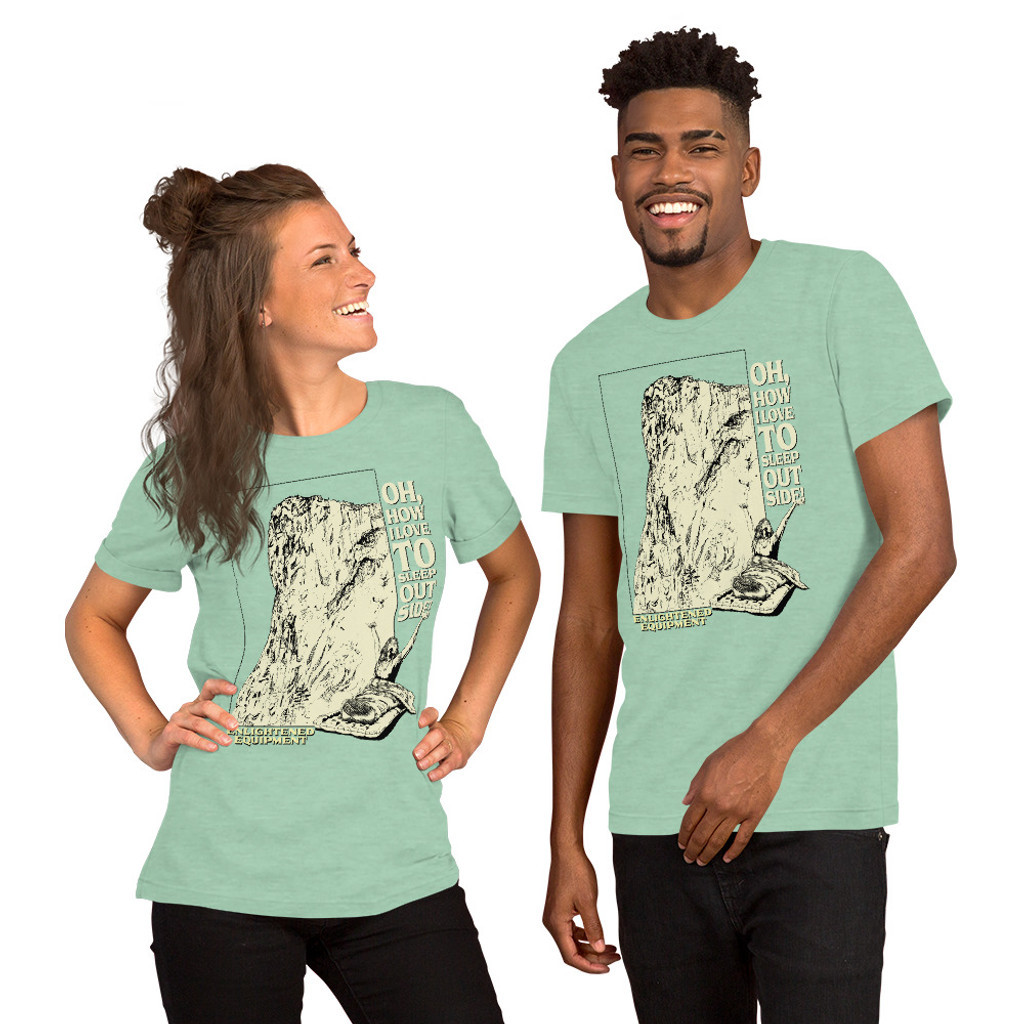 Designed by Kimberly Ross, the design of this shirt shows a stunning sketch of El Capitan, a cliff face known as one of the most beautiful views of Yosemite National Park. The retro/vintage look is completed with the phrase, "Oh, how I love to sleep outside!" down the right side of the shirt, and a sketch of a hiker waking up in their Enigma quilt!