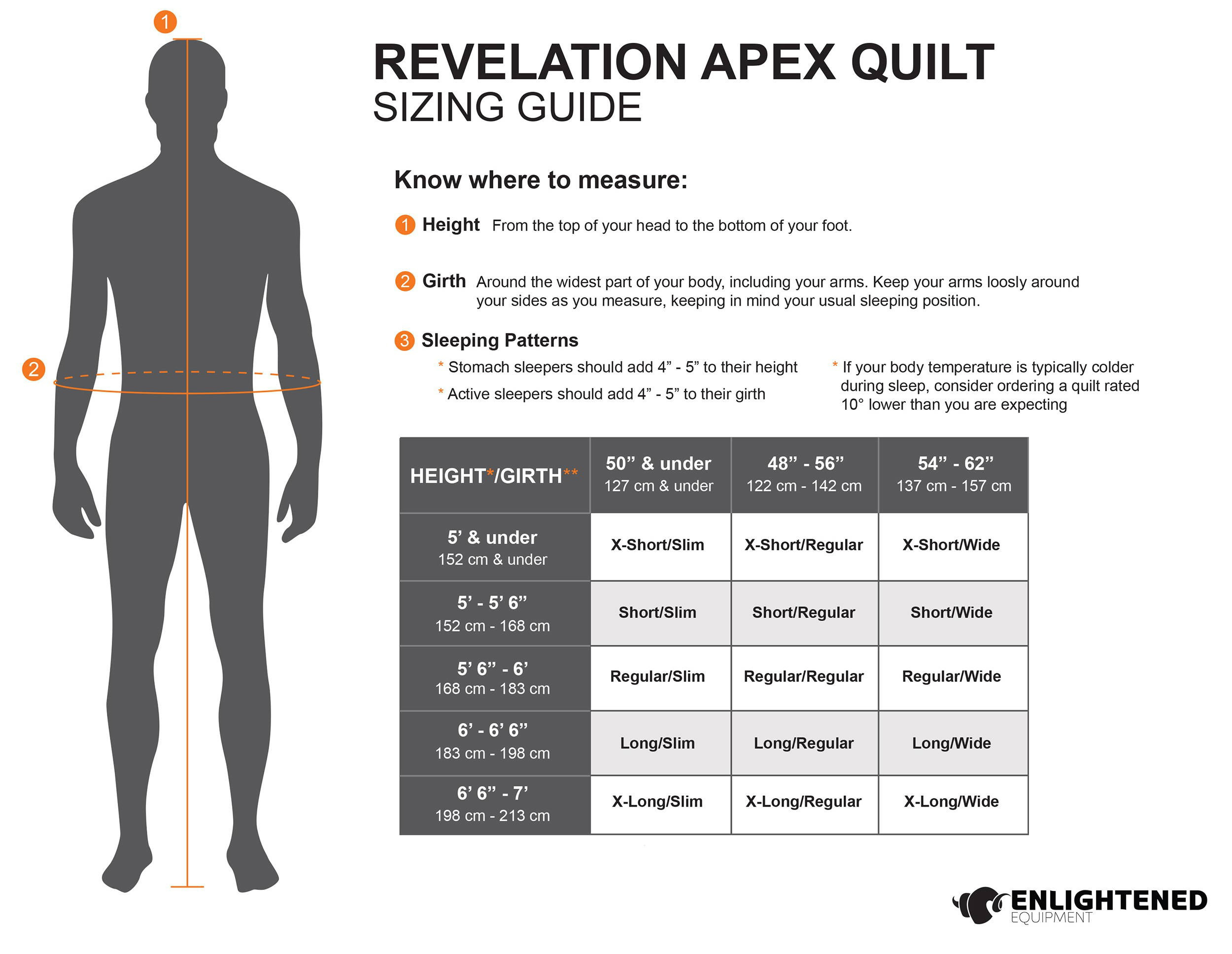 Note: All quilt height and width measurements reference the dimensions of the sewn but not stuffed product. Each quilt type measures differently based on product design. For sizing related questions, please review our size chart located on the tab above. The length measurement below is taken while the quilt is completely open and laid flat. When the footbox is fully closed the length will decrease by 4” - 6”. Unless otherwise noted, this chart reflects the weight of 10D outside and inside fabric.