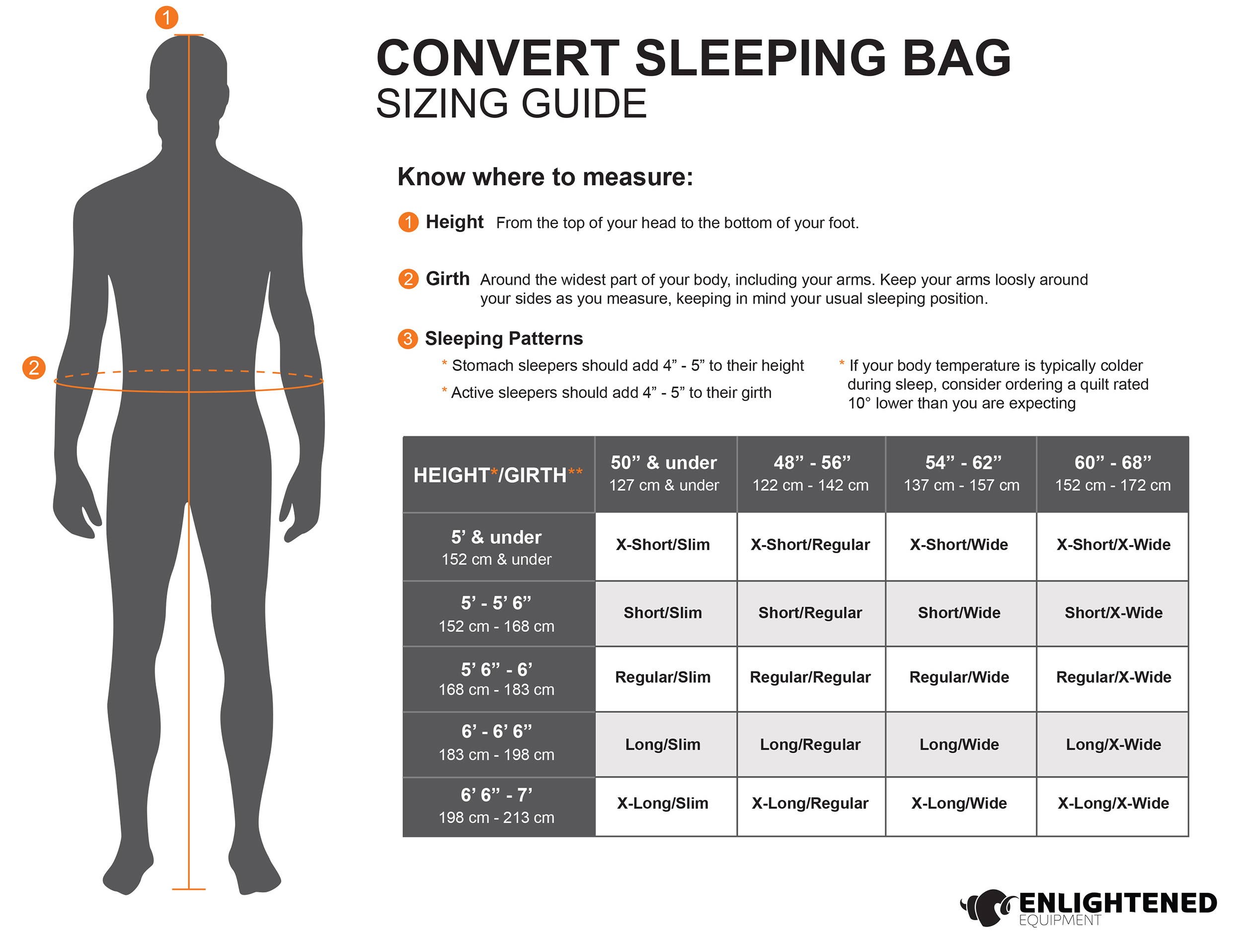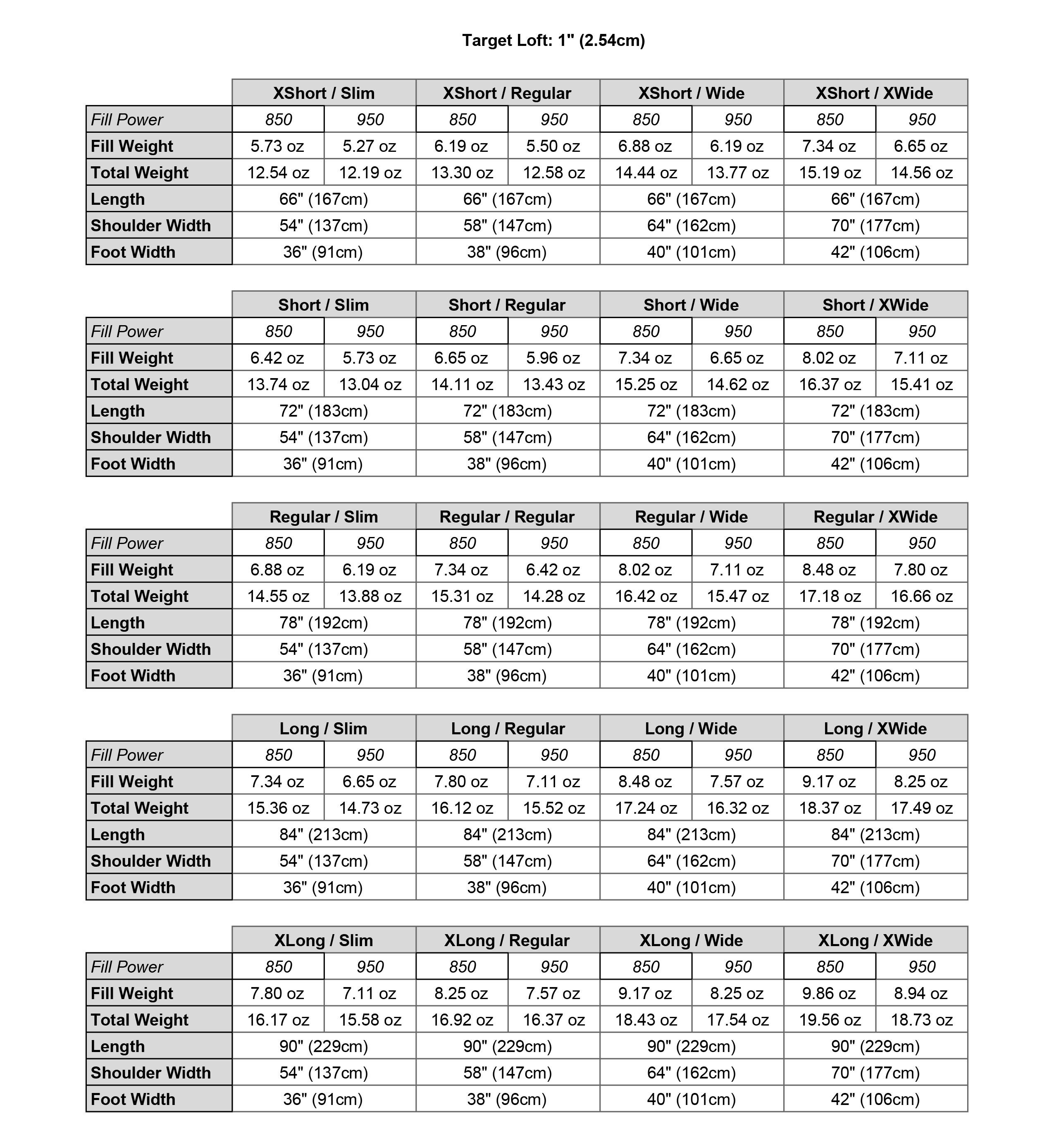 Note: The length measurement below is taken while the sleeping bag is completely open and laid flat. When the sleeping bag is fully closed the length will decrease by 4” - 6”. For sizing related questions, please review our size chart located on the tab above. Unless otherwise noted, this chart reflects the weight of 10D outside and inside fabric.